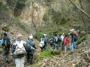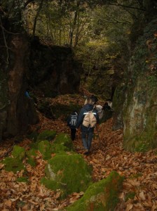 Riprendiamo il cammino e dopo aver seguito un sentiero nel bosco, ci arrampichiamo su un pendio, in modo abbastanza avventuroso, considerando le foglie scivolose sotto di noi.