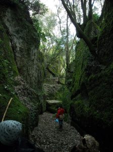 Riprendiamo la strada e quando ormai siamo sotto le case di Blera, papà si dirige verso un cancello di legno con sopra un cartello “ PERICOLO CADUTA MASSI “ …naturalmente entriamo! Siamo all’interno della Cava Buia ( quella di Blera ) e ne vale veramente la pena. Purtroppo presi dal fascino del luogo il gruppo si divide, metà si perdono o meglio proseguono, e non tornano indietro.