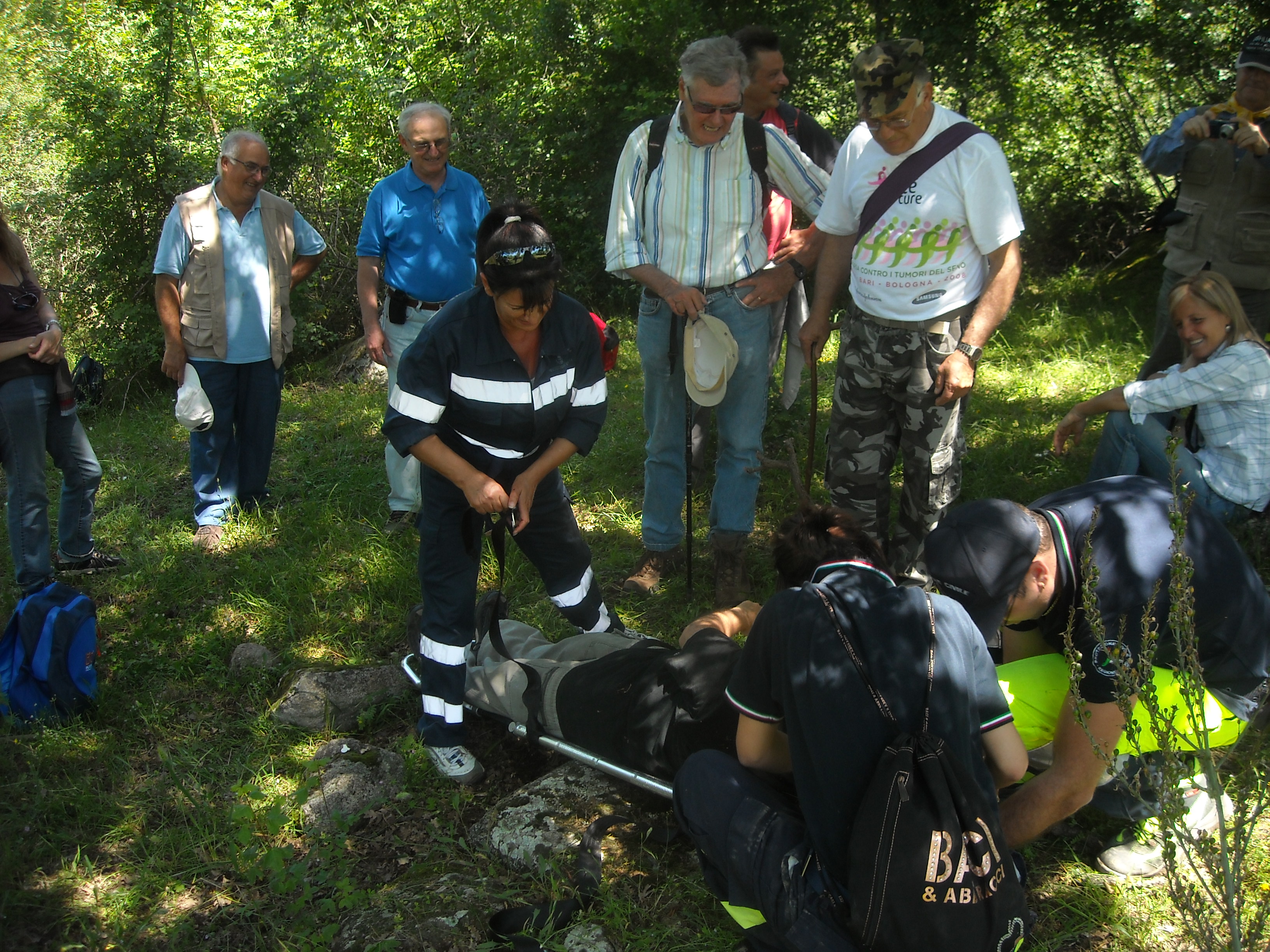 A questo punto abbiamo chiamato la Protezione Civile che è giunta a sirene spiegate in mezzo al bosco (.. data l’ora di punta ) e prontamente ha soccorso Gennaro caricandolo sulla lettiga.