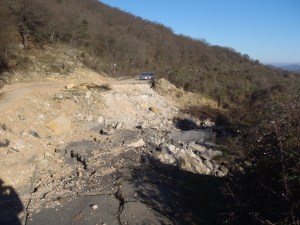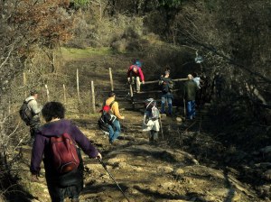 Dopo circa mezz’ora di macchina da Civitavecchia, siamo sul punto di partenza per l’escursione: la strada è interrotta bruscamente per una violenta frana, dovuta forse alle abbondanti piogge di quest’inverno. Ci fermiamo ad ammirare il panorama: la giornata è molto limpida e riusciamo a individuare le cime innevate in lontananza e la cima di Montefiascone.