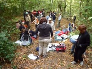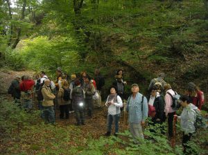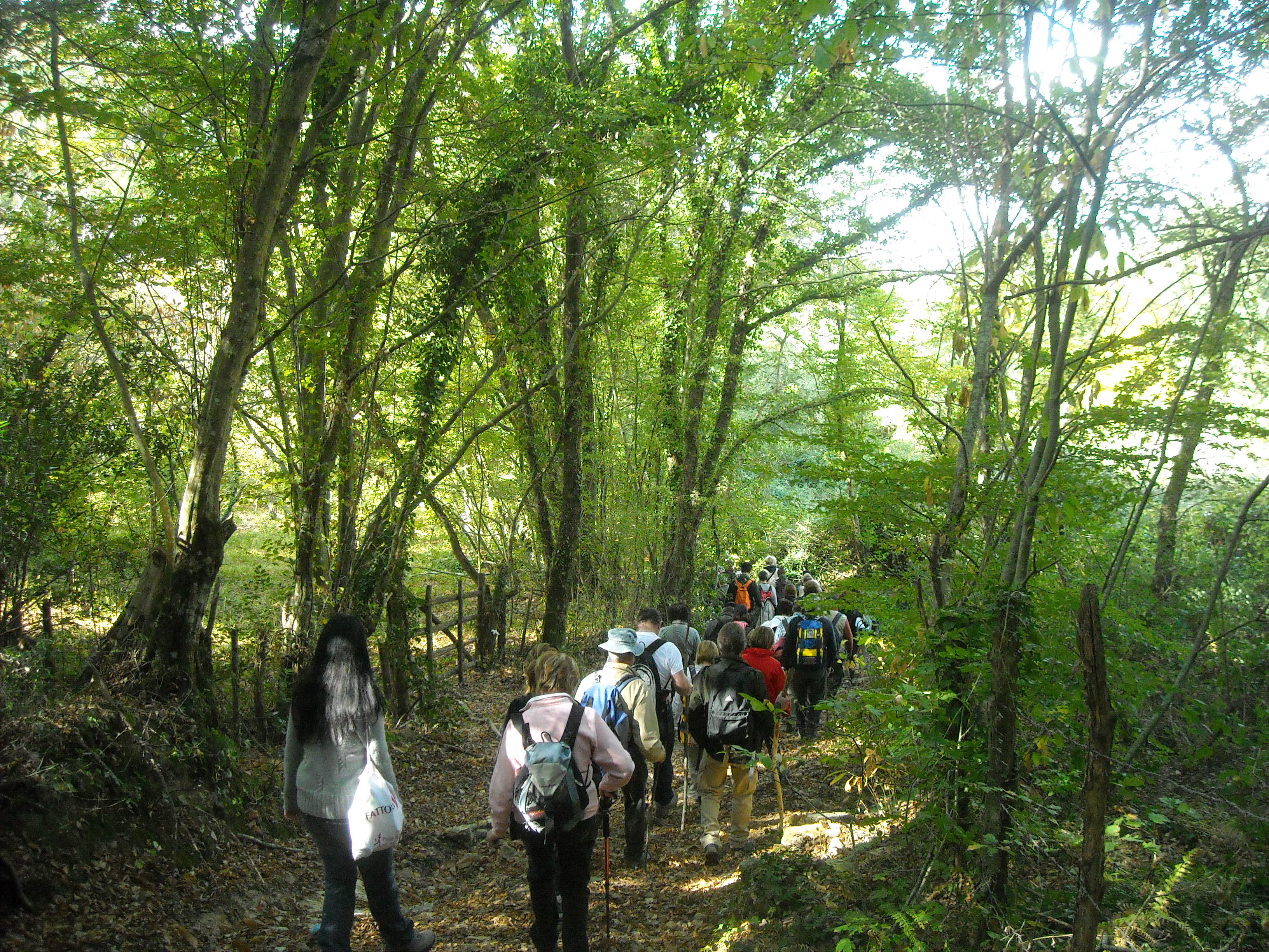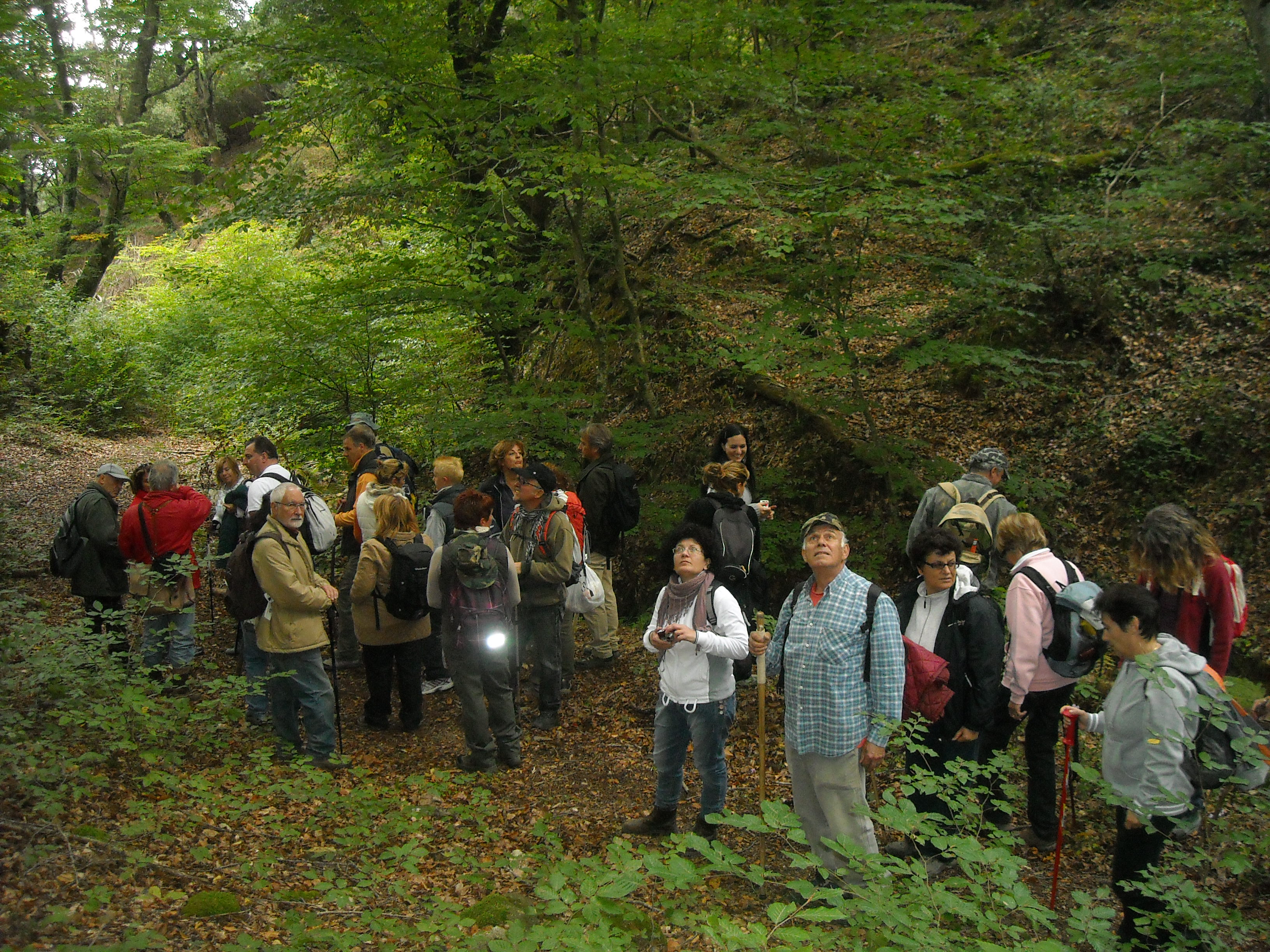 Prendiamo un sentiero, nei pressi dell’Eremo dove troviamo tantissimi cespugli di corbezzolo ( in arte Ceraso Marino ) carichi di frutti rossi e maturi che vengono presi d’assalto. Il percorso continua all’interno del Castagneto Camerale – un bosco piantato nell’800 per creare nuove attività commerciali – ma con la delusione di molti le castagne sono piccole e malate. Ci spiega infatti, uno dei nostri soci, che gli alberi di questa zona sono stati colpiti da una malattia, simile ad un cancro, che li secca lentamente.
